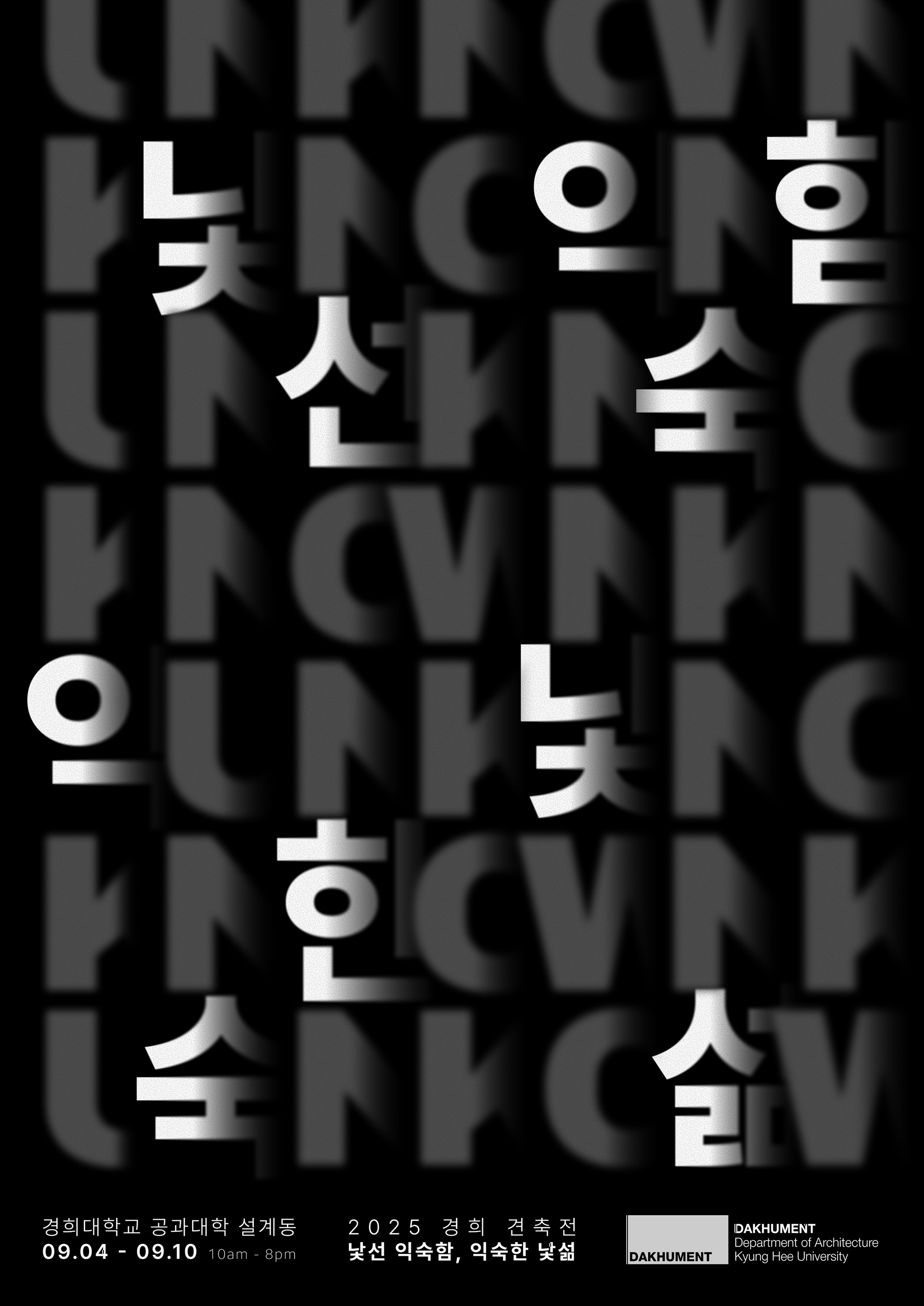 2025년 경희대학교 건축학과 졸업전시회는 ‘낯선 익숙함, 익숙한 낯섦(The Known Unknown, The Unknown Known)’이라는 주제를 통해, 건축이 다시 질문하는 자리로 우리를 초대합니다. 이 주제는 우리가 ‘안다고 믿는 것’과 ‘모르고 있는 것’ 사이의 경계, 그리고 그 경계가 건축 속에서 어떻게 흐려지고 재구성되는지를 실험하는 일종의 공간적 역설이자 감각적 실험입니다.