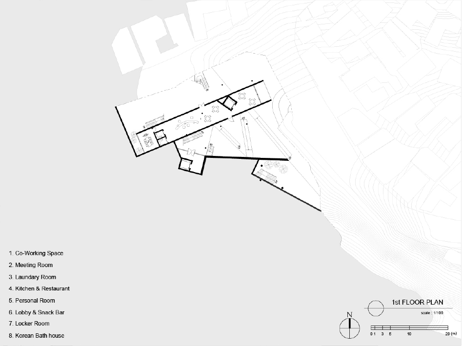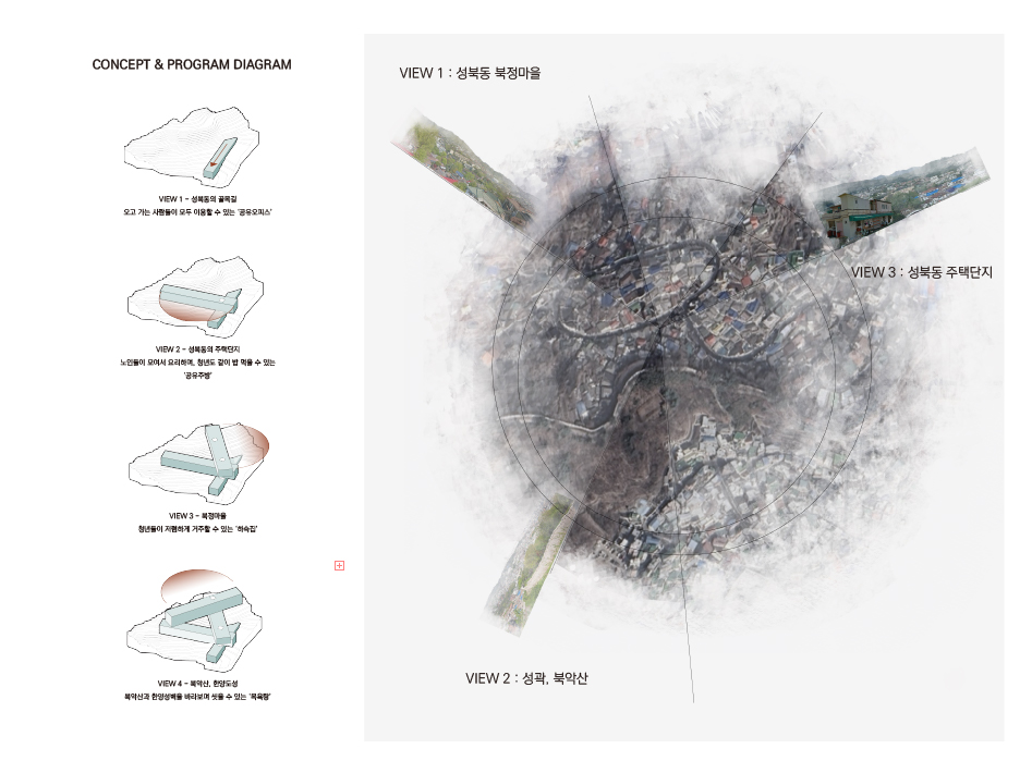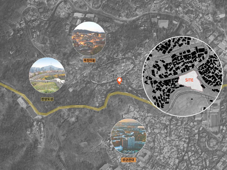 대상지인 성북동 북정마을은 골짜기와 같은 독특한 지형적 특성을 가지고 있어 주변의 아름다운 경관을 조망할 수 있는 잠재력을 지니고 있다. 특히, 인근에 성균관대학교와 한양도성, 그리고 기존의 주택단지가 위치해 있어 다양한 사람들의 왕래가 잦고, 문화적 자원 또한 풍부하다. 이러한 지리적 이점을 활용하여, 프로그램과 조망의 관계를 중심으로 공간을 구성하고자 한다.