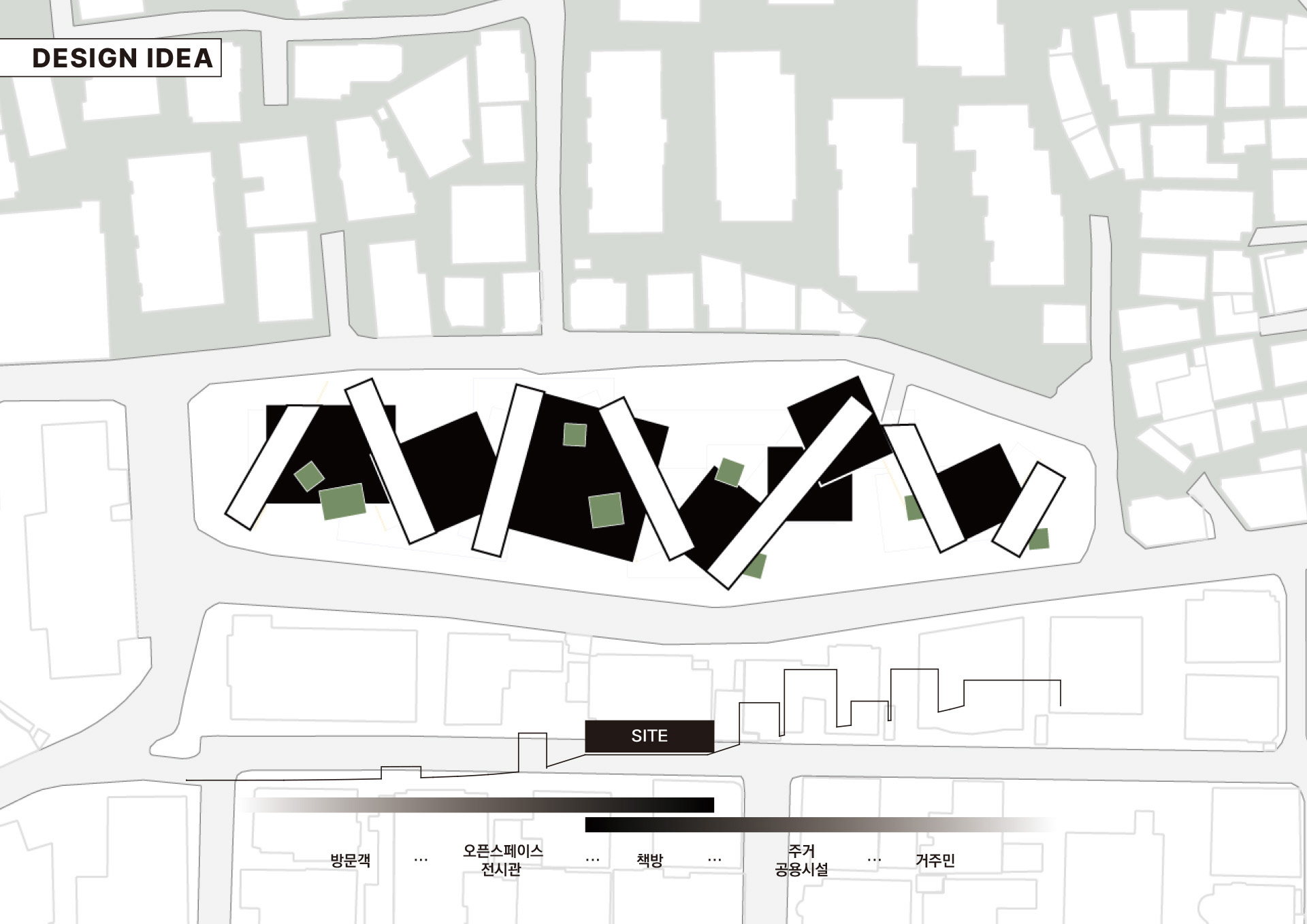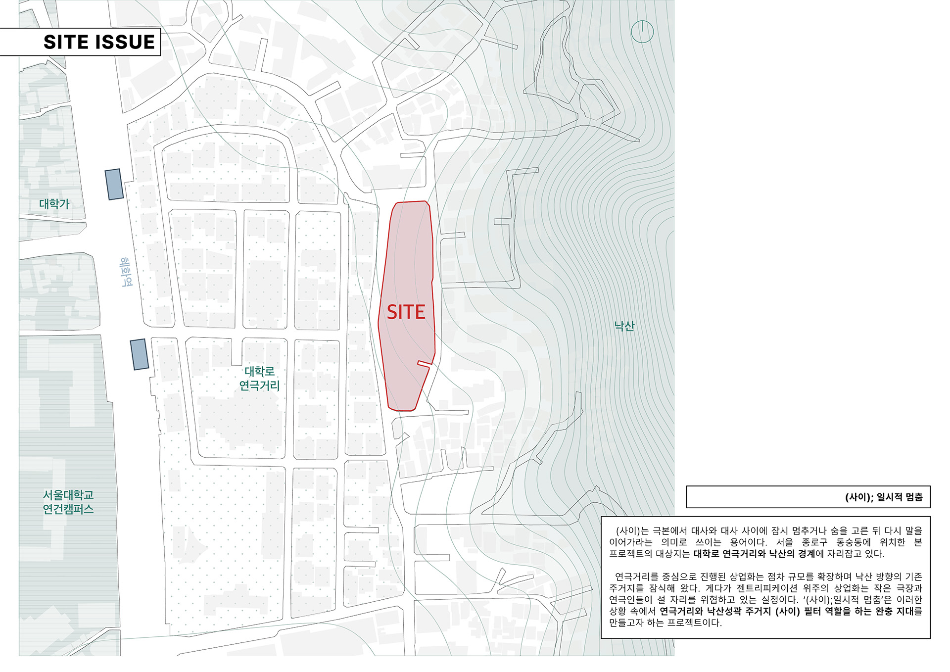 (사이)는 극본에서 대사와 대사 사이에 잠시 멈추거나 숨을 고른 뒤 다시 말을 이어가라는 의미로 쓰이는 용어이다. 본 프로젝트는 대학로 연극거리를 중심으로 한 상업지와 낙산에서 흘러내리는 주거지가 맞닿아 충돌하는 이 필지에서 ‘사이’로 작용하는 경계를 형성하는 것을 목적으로 한다.
