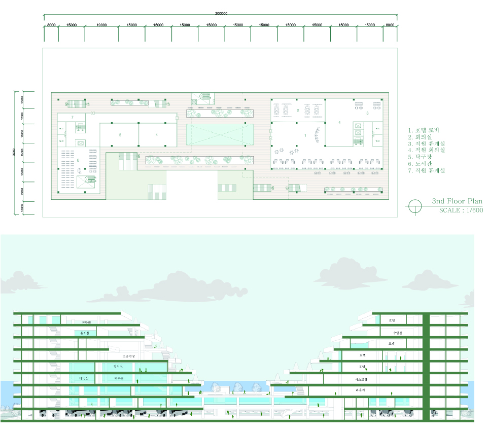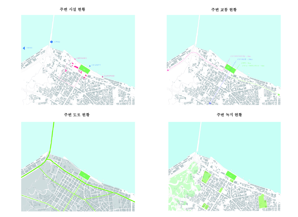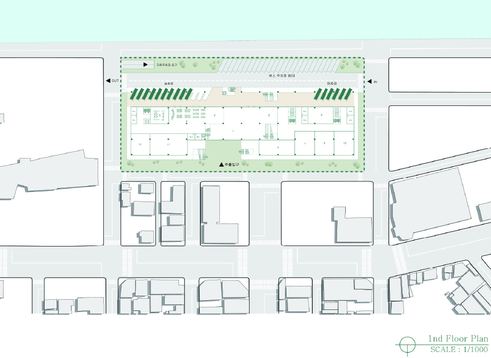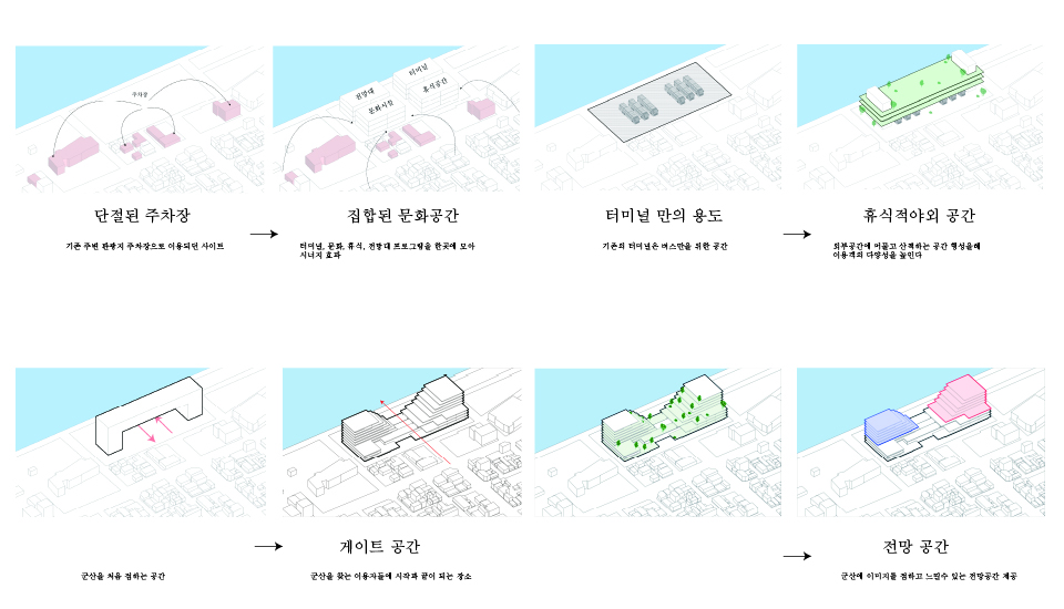 터미널은 도시의 관문 같은 공간이다. 타지역에 있는 사람이 도시를 방문했을때 처음 접하는 공간이자 도시를 떠날때 마지막으로 머무는 장소이다. 기존의 터미널은 사람들의 접근성이 높은 도시의 중심지에 위치한다. 이러한 장점에 불과하고 군산 시외 버스 터미널은 단순히 버스를 타기위한 공간으로 사용되고 있다. 이러한 장소를 문화공간과 휴식공간들로 새로 계획하여, 외부인들에게 군산이라는 도시를 처음 느낄수 있는 경험을 강화하고 도시를 떠나기전에는 쉬어가는 공간으로 계획한다. 그리고 상업공간만 있는 도심에 새로운 문화공간으로 활성화 시키고자 한다.