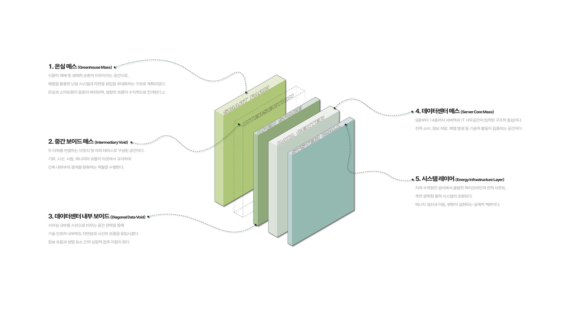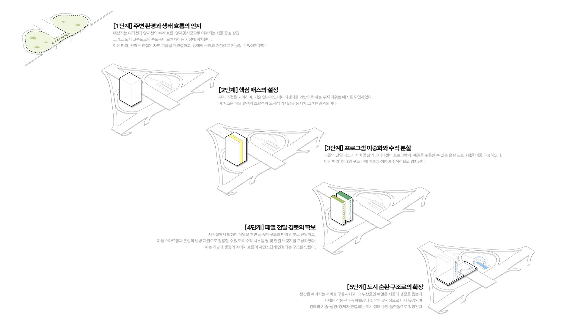 본 프로젝트 「열이 피운 생명, 정보가 만든 숲」은 서울 양재IC 인근 유휴부지에 양재IC 아래를 가로지르는 긴 매스 위로, 데이터센터와 수직 농업 온실 두 개의 수직 타워가 상승하는 형상을 통해 이 문제들을 건축적, 시스템적으로 해결하고자 합니다. 이는 데이터센터의 막대한 폐열을 온실의 난방 에너지로 전환하고, 폐열로 인한 상승 기류를 굴뚝 효과에 활용하여 풍력 발전 효율을 증대시키는 혁신적인 에너지 순환 시스템입니다. 이를 통해 기술과 자연의 상호 의존적인 공생 관계를 재정의합니다.