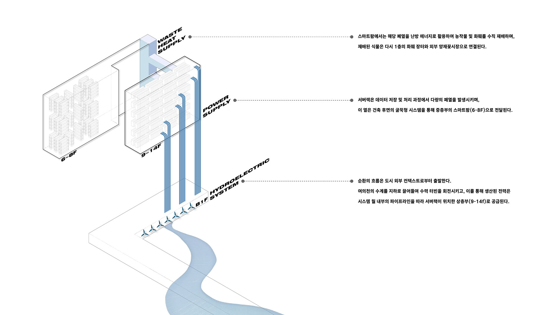 이 건축물은 ‘데이터센터 타워’와 ‘온실·스마트팜 타워’를 통해 물 → 전기 → 정보 → 폐열 → 식물 → 사람으로 이어지는 완벽한 순환 고리를 형성합니다. 여의천의 물을 활용한 수력 발전으로 전기를 생산하여 데이터센터에 공급하고, 서버의 열기는 식물 생장을 돕고 그 결과물은 다시 도시 소비자와 연결됩니다. 또한, 투명하게 노출된 시스템과 설비는 ‘기술은 투명해지고, 기술은 자연을 만든다’는 메시지를 시각적으로 전달합니다.