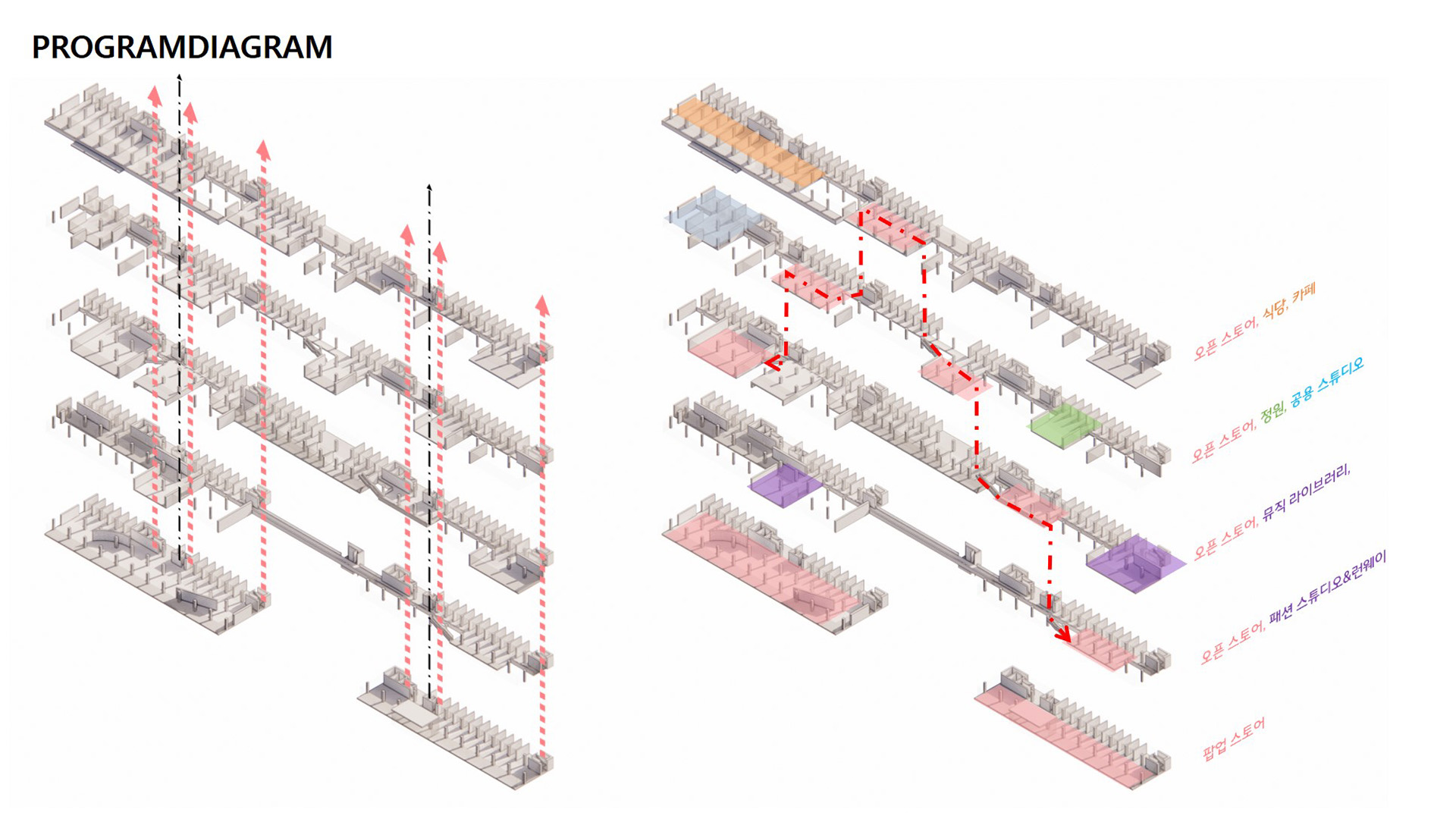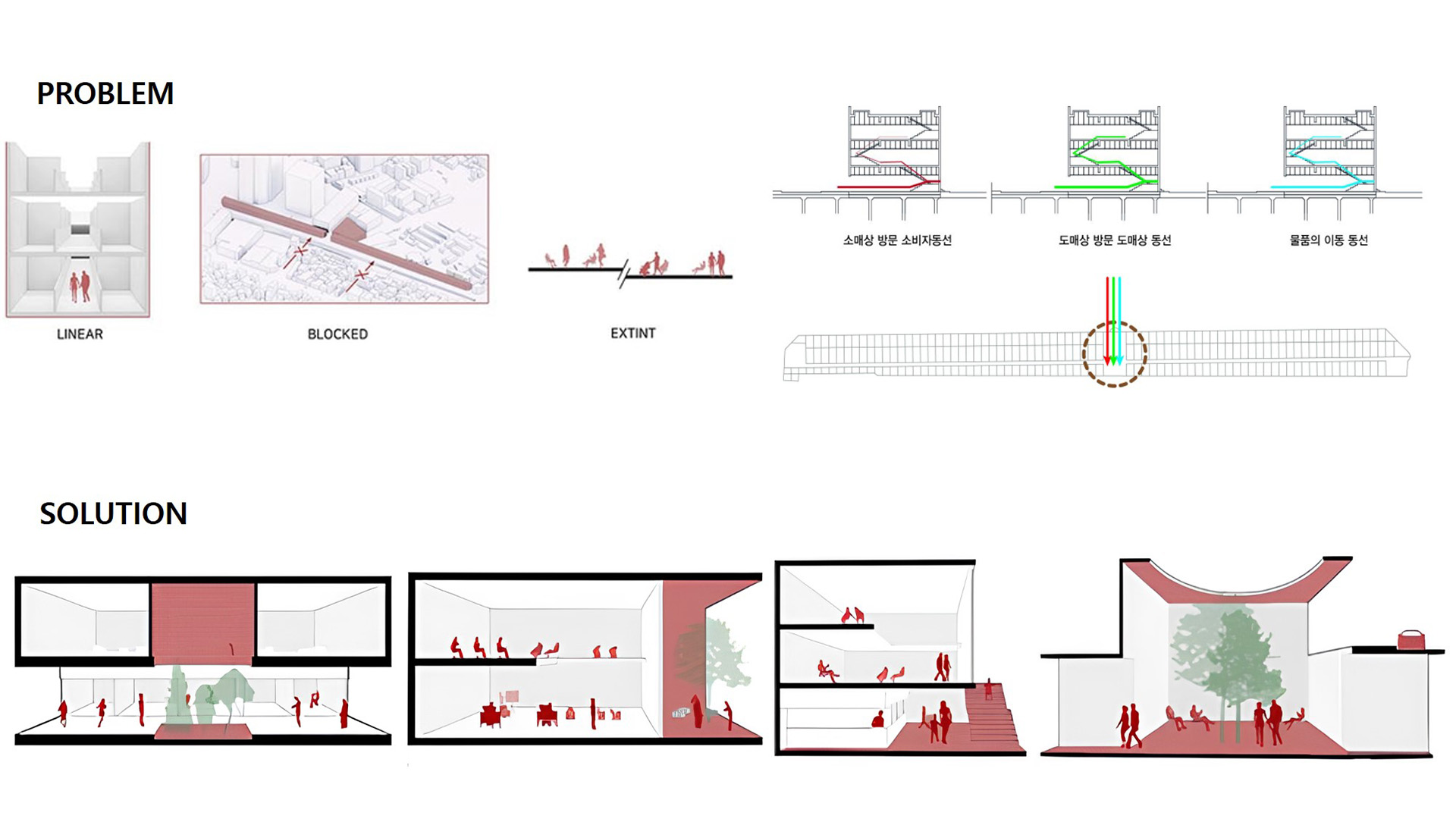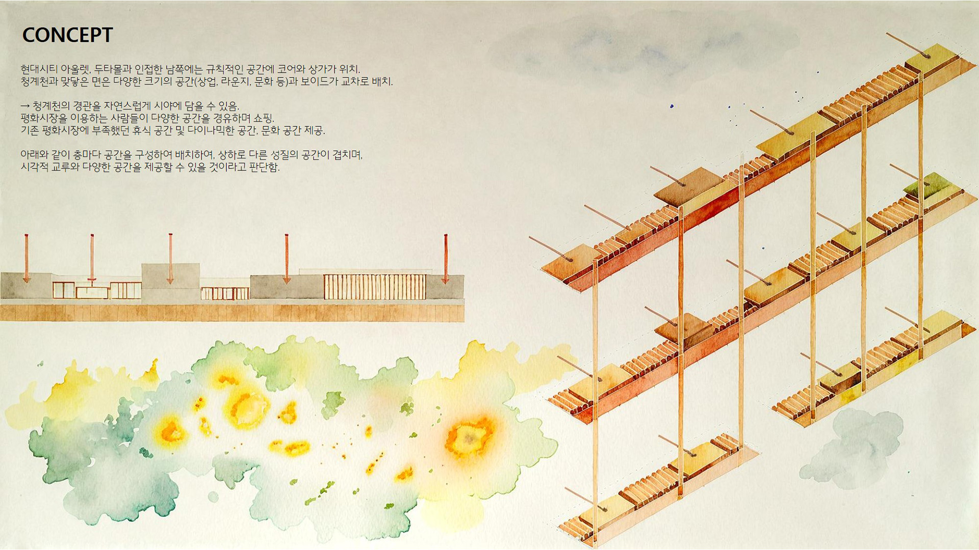 590m나 되는 평화시장의 거대한 매스는 도시공간의 단절을 초래하여 사람들의 유입을 막고 있다. 평화시장의 리노베이션을 통해 동대문시장 일대에 필요하고 부족한 프로그램을 계획하여 쇠퇴한 상가의 기능을 보완하고자 한다. 도시 공간의 단절이라는 문제 해결을 통해 새로운 도시 가로와 시장의 동선을 새롭게 구축하고자 한다. 이로 인해 사람들을 자연스럽게 유입시킬 수 있으며, 도심내에 부족했던 문화 및 녹지 공간을 내부에 담아내어, 청계천과 연계되는 문화 복합 상가로서 변화하고자 한다. 또한, 기존 상가의 단점을 해결하면서도, 도매 상가와 소매 상가가 한 건물 내에 공존하는 형식은 유지하여, 전통과 특징을 지키면서 내부 공간을 활성화하고자 한다.