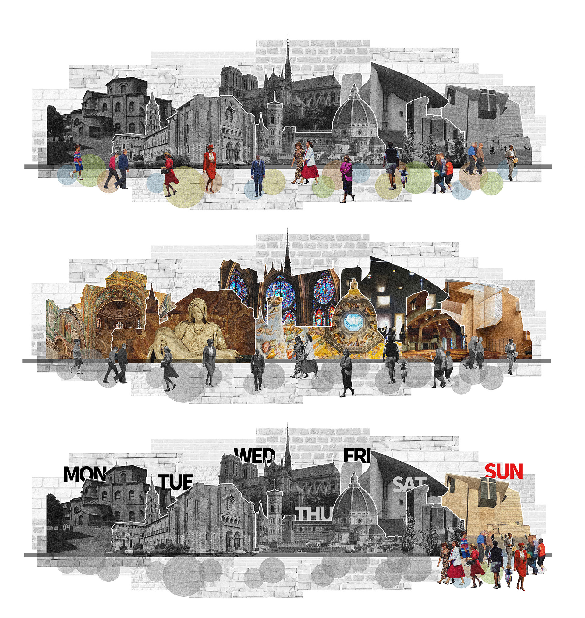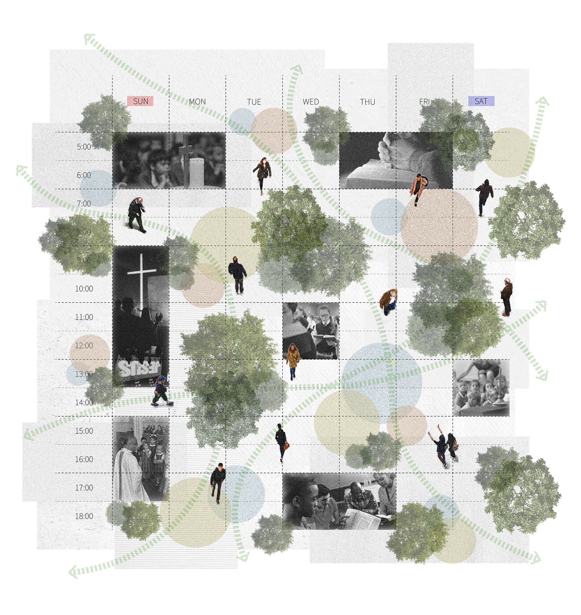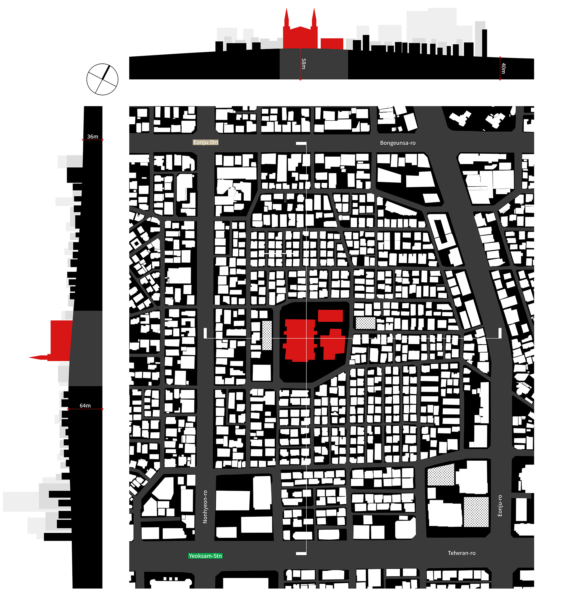 이 프로젝트는 전통적인 종교 건축물이 가진 건축적 틀에서 벗어나 사람과 도시에 기여할 수 있는 새로운 유형의 교회를 제안합니다. 도심 속에서 존재감을 과시하는 단단하고 폐쇄적인 건축 대신 내외부 사이의 자유로운 이동과 공간 경험이 가능한 유연하고 개방적인 건축을 그립니다. 어반 테라리움은 강남의 슈퍼블록 중심에 공공의 녹지와 광장을 제공합니다. 공원은 건축의 일부가 되어 눈에 보이지 않는 분위기와 경계를 만들며 장소성을 구축합니다. 이 분위기는 교회의 가장 중심에 위치한 예배당까지 이어지며 교회의 외부에서부터 내부까지 자연스럽게 연결합니다. 예배당은 광장과 같이 공공의 성격을 가져 다목적으로 이용할 수 있는 사회적 성격의 대공간으로 기능합니다. 어반 테라리움은 종교적 목적의 공간을 넘어 다양한 사회적 기능을 담아 사람들 사이의 유연한 관계를 만드는 장소를 지향합니다.